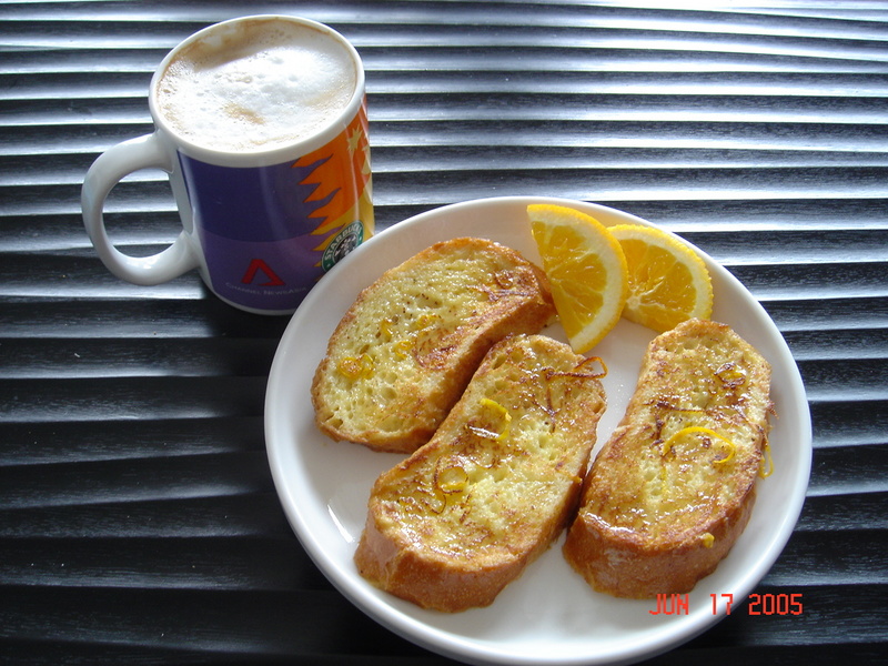 前幾天買了一本William-Sonoma 出的Breakfast專書,剛好有昨天剩下的法國麵包,所以今早就來做French Toast。不知大家一般是怎麼做French Toast的?我通常是打個蛋,將麵包沾上蛋汁下去煎而已。不過今天照著食譜做,加了vanilla extract、nutmeg和orange zest的French Toast,味道果真不一樣。有香草和橘子混合的香味,淡淡的,聞起來真舒服。配上一杯咖啡,真的讓人有度假的感覺。