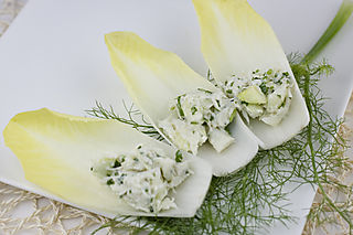 2. Trim the root ends from the endive heads and separate into spears. Arrange 24 of the largest spears on a platter. Spoon a generous amount of crab salad onto the wide end of each spear, garnish with the remaining chives, and serve.