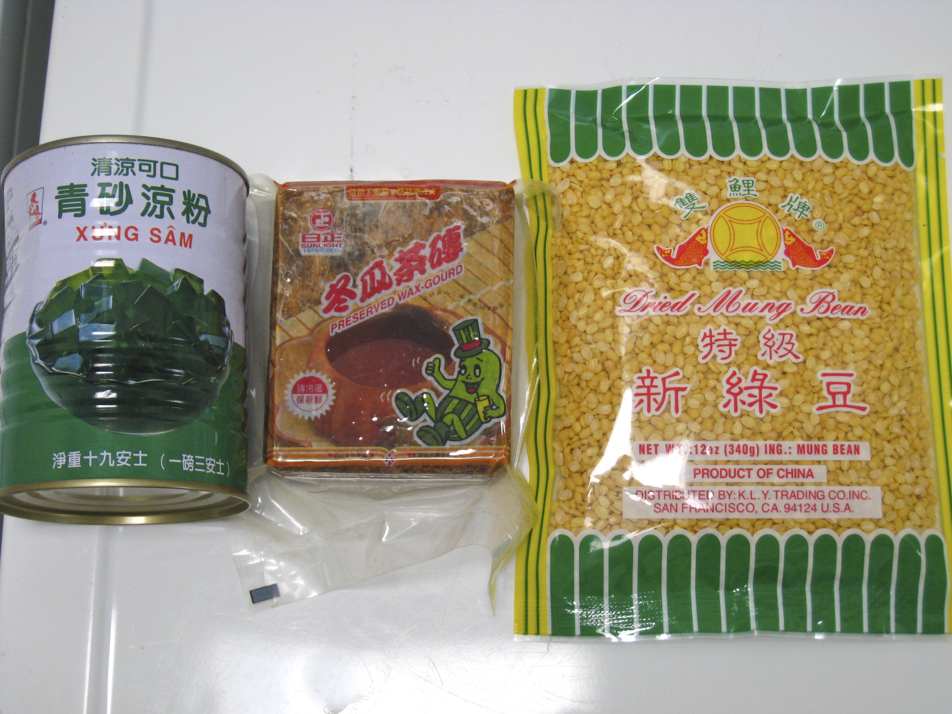 第三, 煮些消暑涼品來降低體內溫度. 我常做的是去殼綠豆湯和冬瓜茶, 在一般華人超市都買得到去殼的綠豆和冬瓜茶磚. 一包綠豆我通常可以分二次煮, 因為我喜歡多一點湯; 一塊冬瓜茶磚可配三到四千西西水下去煮, 端看你愛甜的程度. 昨天去朋友雪莉家, 她給我喝了一碗冰涼的冬瓜凍 (很像愛玉的膠質口感, 但沒那個凝固), 比純喝冬瓜茶要有趣, 她給了我一罐“青砂涼粉”, 和洋菜功能很像, 不過是綠色果凍狀, 在冬瓜茶磚溶解後加入, 等涼了就會變成冬瓜凍, 裝碗放入冷凍庫約二十分鐘又是另一種風味.
