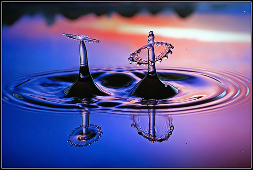 This is a high speed flash capture. Two pairs of consecutive drops, controlled by my home made electronic devices, fell into quiet water surface with a specific time difference; the first bounce hit the second drop and create beautiful splash.