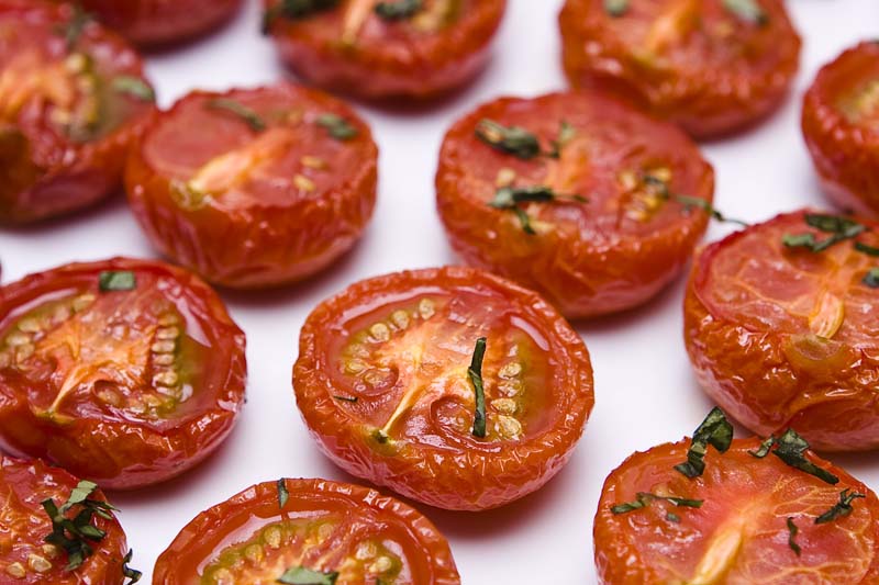 第一個是Saveur 網站上的 Oven-Roasted Plum Tomatoes. 我是去Costco買像高爾夫球大小的番茄, 因為一來找不到Plum Tomatoes, 二來這道菜要烤三小時, 最後番茄會縮水, 所以用高爾夫球大小的番茄應該剛好, 我想如果經費夠, 改用Dry Farm Tomatoes的滋味還會更棒. 這道小菜可以單吃, 也可以放在切片的法國麵包上吃, 耐心等待慢烤三小時是很值得的, 因為滋味簡單美味, 會一口接一口, 即使隔天加熱再吃, 也許樣子沒有剛出爐的漂亮, 但是味道依舊.