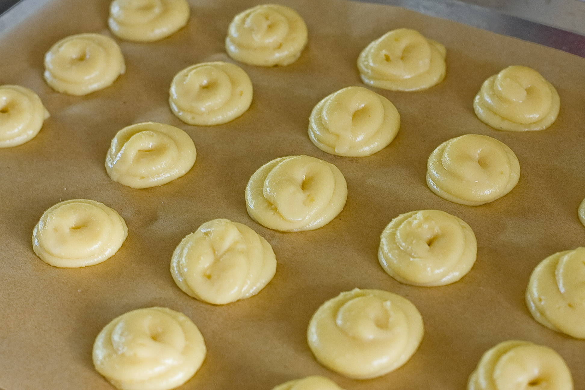 原食譜取自Food Network, 你可以吃原味, 或者加甜的或鹹的餡. 這次Chef Candy是做鹹的餡, 她先將Cream Cheese用食物處理機打勻, 加進切丁的Chive, 拌勻後到入做甜點用的三角袋, 將Puff頂端切開, 擠起士醬進去, 將Puff蓋上就完成了. 你也可以用不同口味的果醬代替. 在做的過程中有一點要注意, 當你將麵團以旋轉方式擠出 (如左圖), 結尾通常會是尖尖的, 需要用手指沾水將尖點輕壓平之後才進烤箱, 這樣在烤的過程才不會焦. 看著麵糊在烤箱裡圓滾滾的膨脹, 很可愛喔. 這個應該也蠻適合給小孩的點心, 因為大人都很難自我控制, 常常一個接一個的吃.