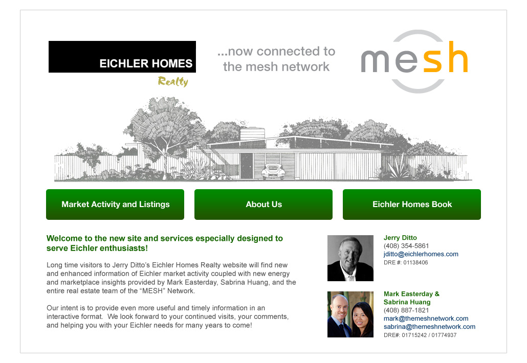 13. 最後一件事是買下Jerry Ditto的Eichler Homes的生意 (他準備退休), 擴展我們對Eichler房屋的市場觸角. Jerry Ditto可說是第一位專賣Eichler房屋的real estate agent始祖, 他不但向許多原始屋主收集早期房屋藍圖, 建商賣屋的廣告宣傳單, 自己還出版了一本Eicher Homes的書, 也是灣區唯一一位地產經紀長期追蹤灣區 (San Mateo County & Santa Clara County) 所有Eichler房屋的買賣交易紀錄, 對Eichler Homes的Knowledge非常深遠.