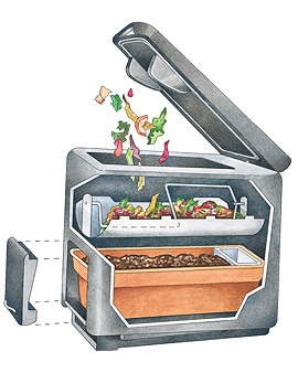 今天收到Williams-Sonoma寄來的目錄, 其中有一台室內的電動儲餘回收機 NatureMill Pro Composter (12" x 20" x 20" high), 體積大小剛好可以放在水槽下方或是某個廚房角落, 機器外殻是以回收塑膠製成, 你可以將任何蔬果皮, 咖啡渣, 茶包袋, 蛋殻等類從機器上方丟進去, 另外連魚肉類都可以 (記得把茶包上的細繩, 玉米心, 骨頭等取出, 避免機器卡住), 它會自動攪拌, 沒有味道, 而且安靜, 有機土每二週就會落在機器下方的抽屜裡, 比蚯蚓式製作有機土更方便快速, 但是價格也略高就是了.
