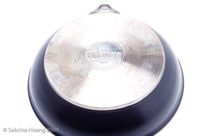 後來我又想找一個All-Clad不沾平底鍋的替代品, 尺寸介於10至15吋之間, 因為有時候炒一點菜, 用十吋的All-Clad不沾平底鍋太小, 用十五吋的台灣大炒鍋嫌太大, 所以就看上了Circulon Infinite這牌子的不沾平底鍋, 尤其被它號稱可以放進洗碗機清洗給吸引 (只有Infinite這系列可以), 因為到目前為止, 還沒看過哪一個不沾鍋說是可以進洗碗機洗的.