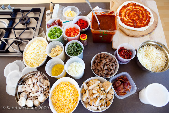 為了搭配這次酒題, 食物方面我們選擇Home made Pizza, 一來好搭配無法事先預知的酒類, 二來方便省事又受歡迎, 三來食材準備簡單, 花費也較少. 為此, 平常幫我們準備食物的Chef Candy還特地幫我們找來專做披薩的Chef Gil, 從披薩麵團到各樣配料都是他前一天就準備好, 當天他只要按客人喜好放Topping, 然後放進烤箱六分鐘就有熱騰騰的Gourmet Pizza可以享用囉.