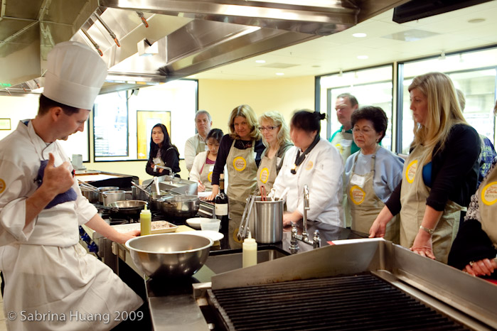 每人當天都收到一份講義 (裡面有擺盤重點, 當天菜色和醬汁的食譜) 和印用 PCI Logo的圍裙一件. 如果早到, 他們還提供Pastry, Juice and Coffee. 當天的主廚講師是Chef Jeremy MacVeigh, 我們先坐在Demo Kitchen聽他講解擺盤重點 – 餐廳多半用白色餐具, 因為白色可以襯托出任何顏色的食物; 有些餐廳用深色或黑色餐具, 呈現不同氣氛, 但要小心深色容易吃掉食物顏色. 他提醒我們, 冷食要用冰過的盤子, 熱食要用保溫過的盤子, 才能維持食物本身樣子的鮮度. 在擺盤上, 要注意Colors, Textures, Shape, Height, Plate Coverage, and Cleanliness.