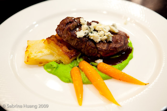 4. Grill Steak on top of Potato Gratin with English Pea Puree and Baby Carrots, finish with Bordelaise sauce