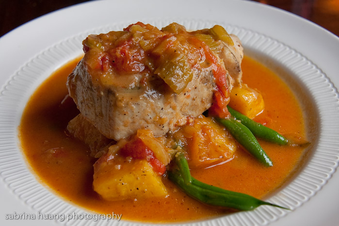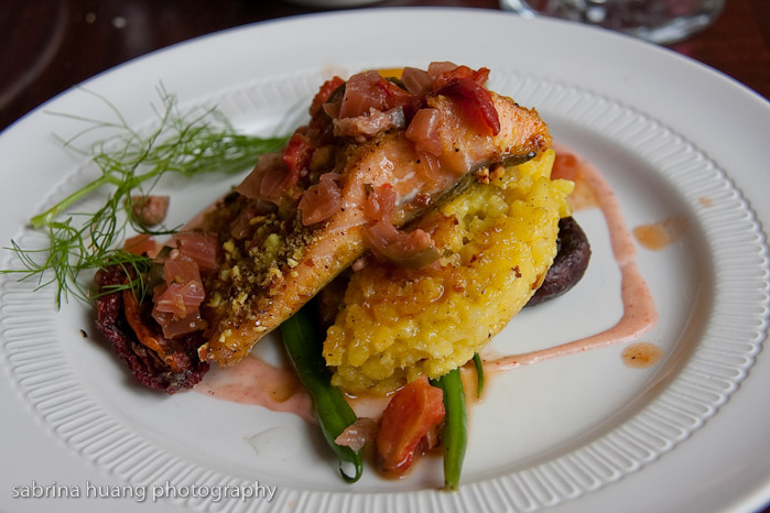 主菜我們原本點Almond Crusted Utah Trout with Blood Orange-Caper Berry Pan Sauce, 結果菜上桌後我吃了幾口覺得太鹹, 就把菜退回去, 改點Marseilles Albacore Tuna with Saffron Risotto, 結果我感覺鮪魚有點腥味, 而且有筋, 不如日本餐廳生魚片的品質, 不過我還是把它吃完了 (我想它們把這二道菜的配菜放錯了, 才會造成太鹹的問題, 因為Trout 應該配湯汁, 鮪魚才是配Risotto).