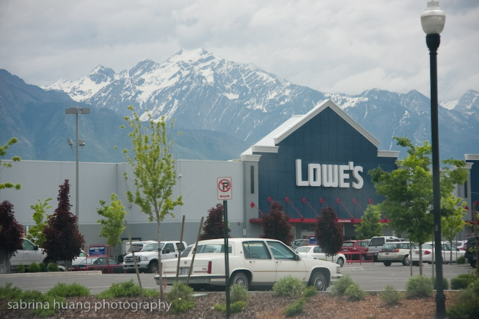 晚餐後我們去Smith Marketplace (Safeway 加 Target 的綜合體, 很大一家, 有賣可嚼式煙草) 買乾冰 (加州要到特別的店買, 有些州在一般超市就可買到), 然後回飯店寫這篇遊記, 路上看到一些蠻特別的建築, Lowe's還有雪山當背景.
