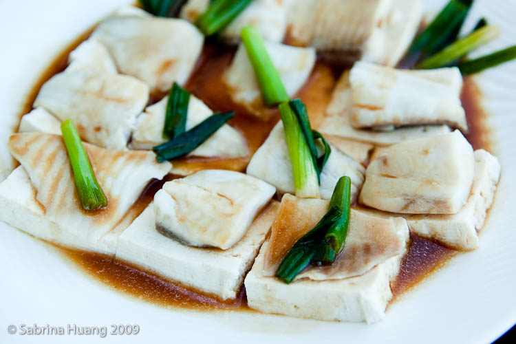 > Arrange tofu slice on a thinly oil coated plate, sprinle #2 on top of tofu and then place fish fillet on it. Bring water to boil, steam the fish tofu for about 8 minutes over high heat (leave the lid slightly ajar to let steam out so tofu won't crumble and become tough). Discard the cooking juice.
