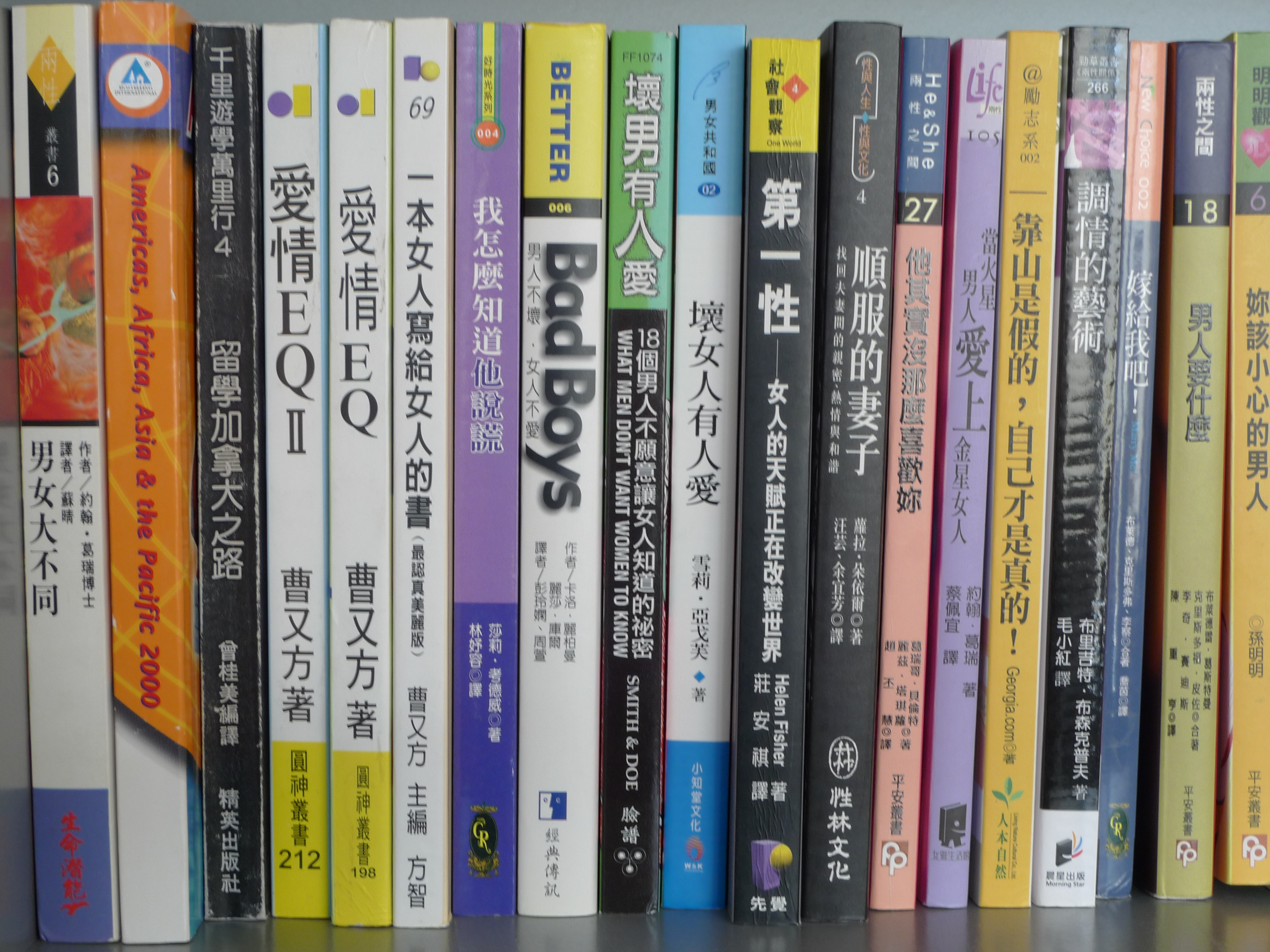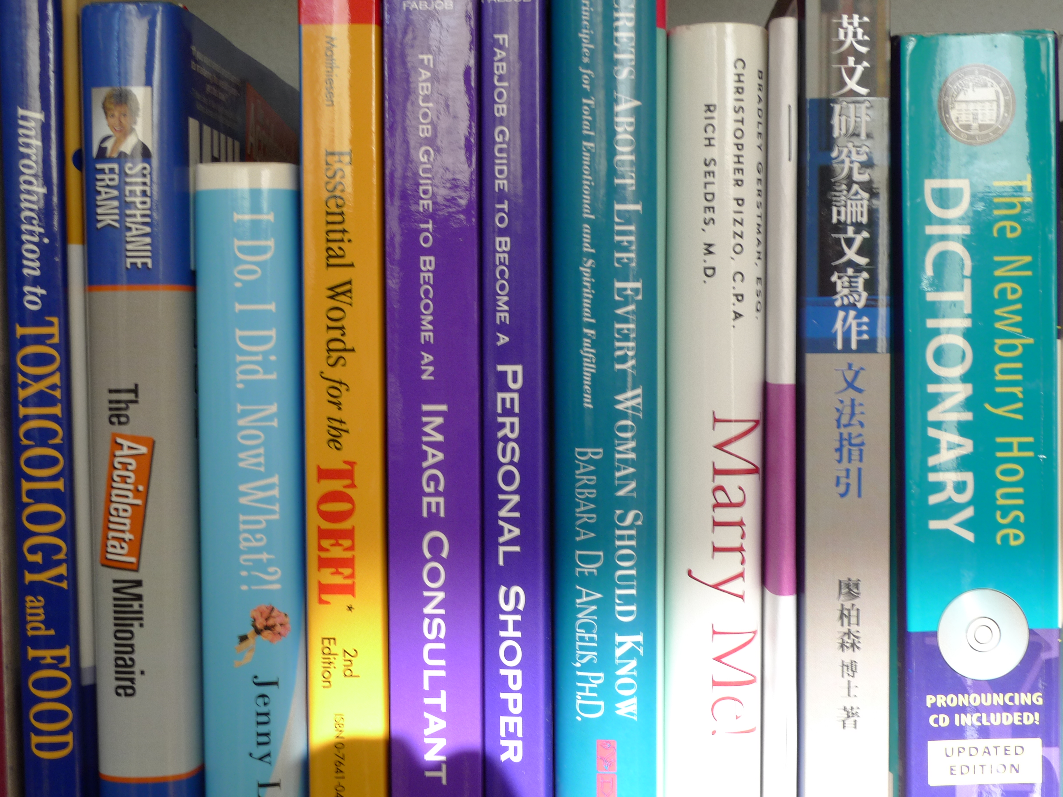 一是我有很多中文繁體書, 主題廣泛, 從旅遊, 食譜, 園藝, 勵志, 成功人士自傳, 市場行銷, 房地產, 彩妝, 攝影, 散文小品, 佔滿六個書櫃. 近年來中文書看得少, 所以很節制不買, 但是英文書越來越多, 實在需要謄出空間歸放, 所以想問問看各位有沒有人想領養幾本中文書回家, 不然的話, 我可能就將書裝箱, 捐給圖書館了.
