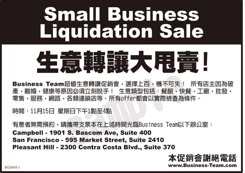 Investments, Real Estate 想自己做老闆的機會來了 Date: November 9, 2009Author: Sabrina 1 Comment Linda告訴我, 這週日他們公司有一個一年一度的生意轉讓大拍賣, 有興趣了解詳情細節的人, 請盡速和Linda連絡. (下則廣告於週一見報) Linda Lu408-385-0408businesslinda@yahoo.comThe Pruneyard, 1901 S. Bascom Ave, Campbell, CA 95008 Share this: Click to share on Facebook (Opens in new window) Facebook Click to share on Threads (Opens in new window) Threads Click to email a link to a friend (Opens in new window) Email Click to print (Opens in new window) Print Like Loading... Related