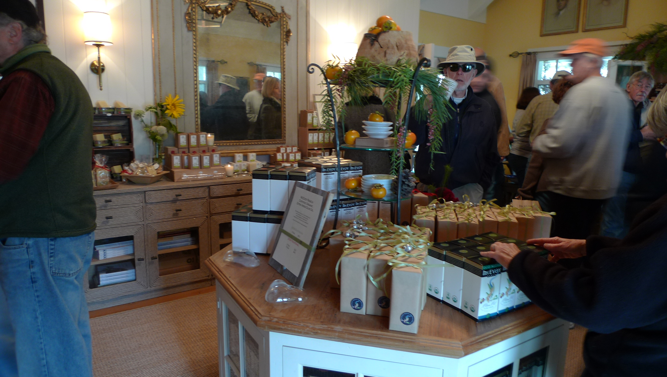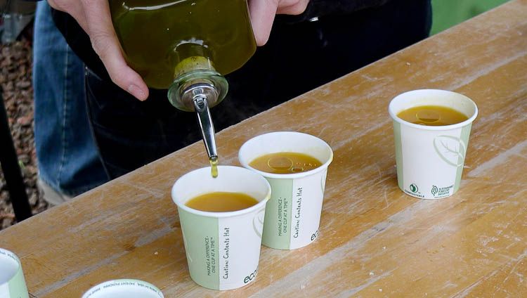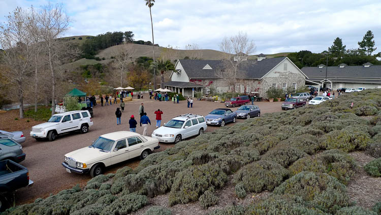 走到室外, 看到一處人群排著隊等候, 好奇心驅使, 我走過去一探究竟, 每個人腳邊都有一桶桶剛採下的橄欖, 有紫有綠, 還有玻璃瓶. 我開口詢問, 原來每年的十一月和十二月是Family Mill Day, 住在灣區的人家裡若有橄欖樹, 每年可以趁這個時候將橄欖採下, 帶到McEvoy Ranch稱重換油. 每磅橄欖付一塊美金, 將橄欖給他們, 他們會給你同值的橄欖油帶回家 (基本上一棵成熟的橄欖樹可以生產約七十五磅的橄欖, 相等於一加侖的橄欖油).
