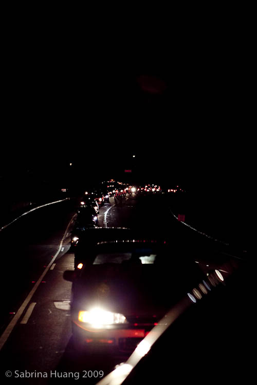 拍Low Light景象, 通常要用Tripod和Long Shutter Speed, 但是我們坐在車上, 而且車子是處於移動狀態, 上述條件不合適. 如果你的相機可以做某些設定 (一般傻瓜相機都有這些功能), 那就把ISO調到800, 照相品質調到Large Fine, 設在AV, 這樣如果車子處於停止狀態, 應該可以拍到還不錯的照片. 但是因為ISO很高, 這一類的JPG相片品質,只夠上傳到部落格使用, 印刷品質可能不太好.