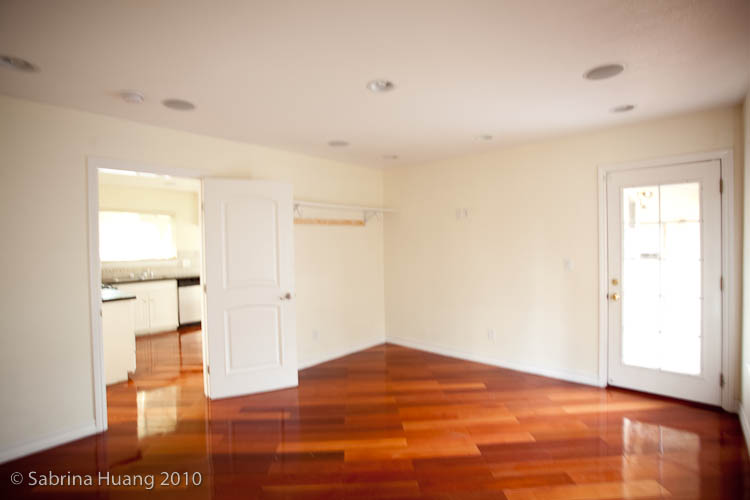 唯一有牆壁隔間, 有門, 有衣櫥(在相機後面)的房間; 右邊那個門可以通到後院, 左邊那個門可以到廚房和Hallway.