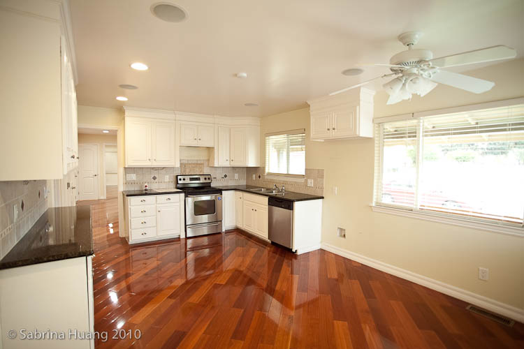 全新的廚房, 只需要買個冰箱; 相機後方是洗衣間和另一個Full Bathroom (忘了拍), 還有側門可以通到車庫.
