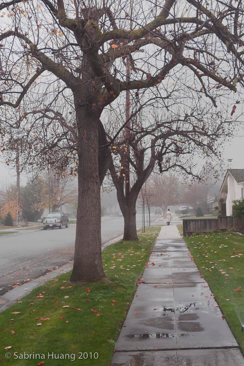 我和老公一週會有幾天因為睡不著而特早起, 然後我們就去住家附近散散步, 我老公喜歡雨天, 我喜歡霧天, 覺得霧茫茫很有一番風味. 這張是用傻瓜相機拍的, 你感覺得到那霧氣嗎? 前方那位女子牽著狗走很快, 害我用跑的都趕不上她, 不然她的位置要是離鏡頭近些就更好了.