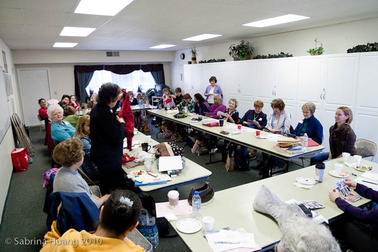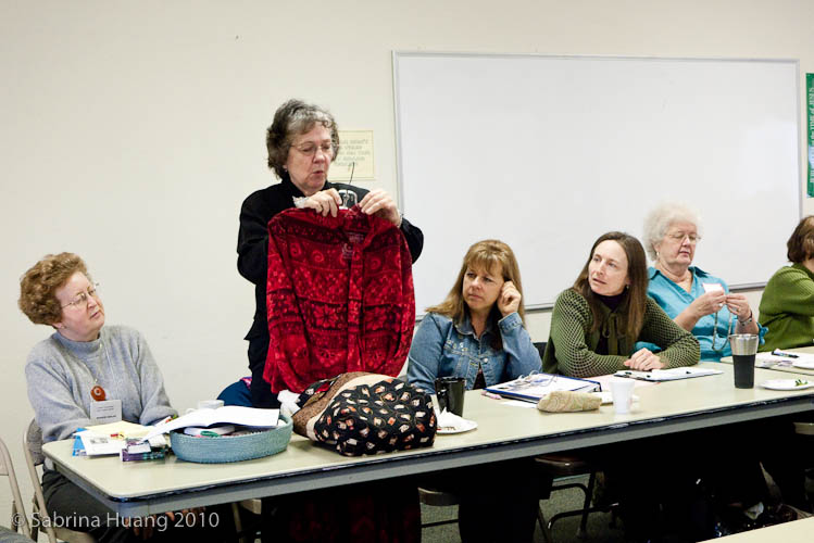 每個Neighborhood Group都有它們的月會, 有的是每個月的第一個週五, 有的是第二個週二等等. 會議一開始先做各種活動的Announcements, 例如哪裡有裁縫慈善活動需要大家作義工幫忙縫成品送給前線的軍人和他們的家庭或是我們社區的貧窮家庭, 哪裡有和縫紉主題有關的展覽或活動或課程, 哪裡有與裁縫材料有關的拍賣等. 接下來就是大家分享最近做的裁縫作品的Show and Tell, 看看別人最近做了甚麼東西也蠻有趣的.現場也有許多布料樣品免費供大家拿取, 規定是不能轉賣, 如果最後沒用到要拿回去給別人用.