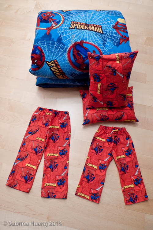 乾兒子喜歡蛛蛛人, 不論是書包, 鉛筆盒, 鉛筆都是蜘蛛人的圖案. 得知乾媽我開始迷上縫紉, 兒子們有天問我可不可以給他們各做一件有蜘蛛人圖案的睡褲和枕頭套? 我說如果我找得到有蜘蛛人圖案的布料的話, 就給他們做. 後來在不同的布料店, 找到紅色和藍色的蛛蛛人的圖案布料, 決定紅色的做睡褲和枕頭套, 藍色的另外做棉被給他們蓋.