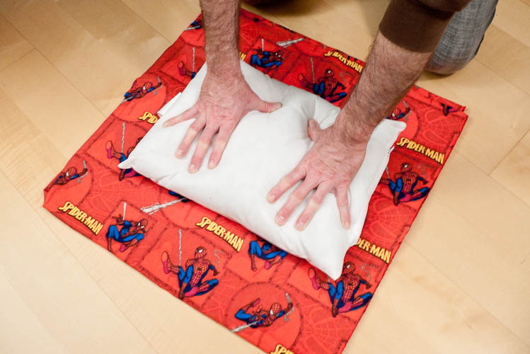 再將有圖案的那面對疊, 將四邊車起, 翻到正面後就可以直接裝枕頭了.
