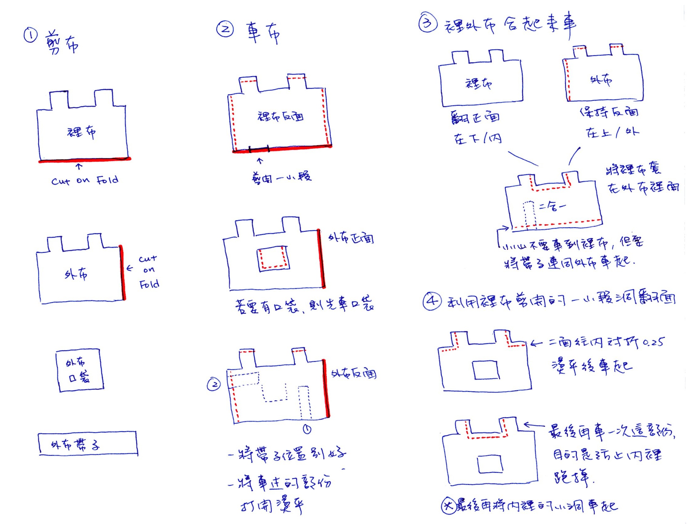 第三步是剪布. 先將剪開的塑膠袋或畫好的樣圖紙用大頭針別在外布上 (注意要將外布的左邊或右邊對折後才剪布), 然後再剪內裡布 (下方對折才剪), 記得看一下最上面手劃圖的解說. 最後你會得到一塊外布是左右相連, 內裡布是上下相連.