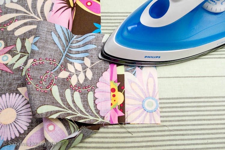第六步是翻面. 要翻個幾次 – 最後從內裡底部的小開口將布翻正, 外布正面在外, 內裡布在內. 攤平燙整, 準備下一個步驟.