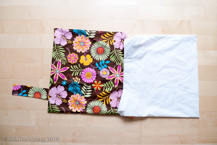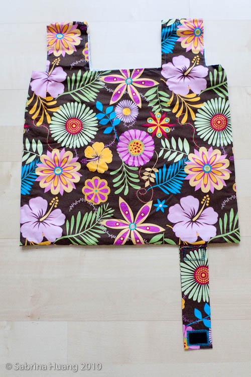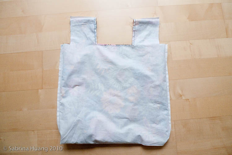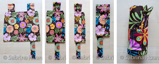 我是將帶子縫在袋子右下方. 將袋子往右對折再對折後, 由把手處往下捲折, 最後用帶子環繞後以魔鬼沾做結尾, 就變成可以隨身攜帶的購物袋啦.