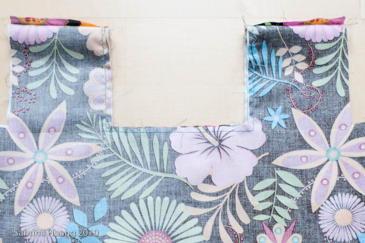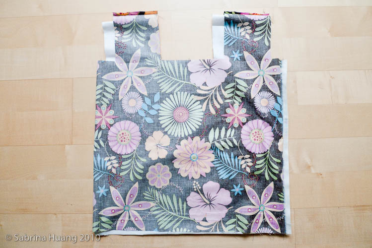 第四步將裡外布分開車. 內裡布先車二個把手上端和袋子身體的左右二邊. 外布若有做口袋則先車口袋在正面 (如果要做帶子, 則將帶子的位置用大頭針別好. 你可以放在袋子的左或右, 也可以放在袋子的下方), 車好了翻反面再車二個把手上端和袋子身體的一邊. 車好後將車過的地方打開燙平, 方便下步驟的車縫.