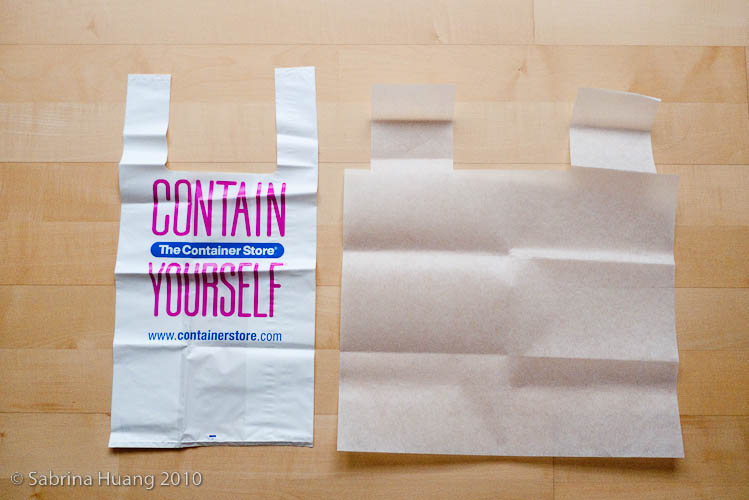 第一步是找一個你喜歡的購物塑膠袋. 我是拿Container Store的塑膠袋來作打樣, 因為一來我喜歡它的大小, 二來它的袋子比較厚, 畫樣圖的時候比較不會走樣. 你要先把二個把手和底部的地方剪開, 打開放平後就像右邊那樣. 我是把塑膠袋放在樣圖紙上將圖形畫好剪下, 因為這時候我可以在樣圖紙上做修改, 例如加長把手的長度或是加長袋子的寬度或深度. 你若想直接將塑膠袋放在布上照剪也是可以的. Container Store的塑膠袋的大小, 1.5 yards的布約做二個.