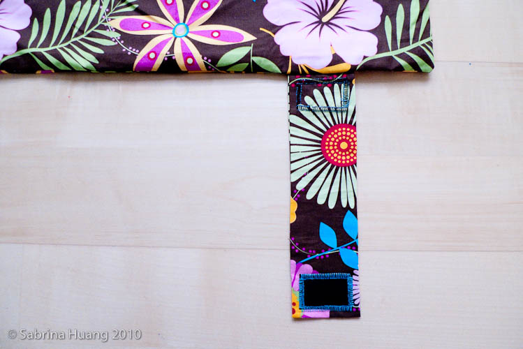 第七個步驟是將二個把手形成的ㄩ處, 從外面將裡外合一車起, 以防止內裡走樣. 然後再將二個把手左右的 L 處, 以裡布和外布互相對折約1cm後, 用大頭針別好, 從外面將裡外合一車起. 然後將內裡布下方剪開的小口縫起.