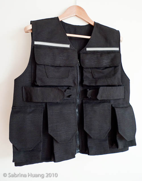 最後的成品雖然不完美, 但很實用 – 背心正面(由下往上)可以裝Canon 17-40, 24-70, 50, 100 Macro等四支鏡頭, 中間可以裝Cable Release and Flash Light, 最上方可以裝Memory Cards, Batteries, Lens cleaning kit; 背心反面可以裝70-200 and 580 EX II, 大口袋可以裝地圖, 零食, 帽子或Lenshood. 整件背心是用戶外布料做的, 所以耐髒耐水, 而且牢固, 另外有加棉質內裡好透氣, 而且還加了反光條, 增加夜間活動上的安全.