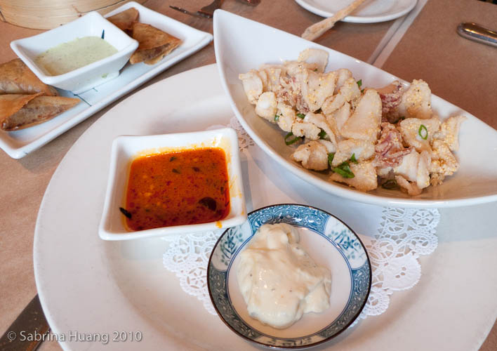 我們點了二個前菜 – Calamari (Polenta Crusted & Served w/ Two Sauces), 和Samosas (Crispy Fried Duck Filled Indian Pastries w/ an Orange-Cilantro Yogurt Dip). 我喜歡它的Calamari, 很嫩, 外面那層炸粉很薄, 口感不錯.