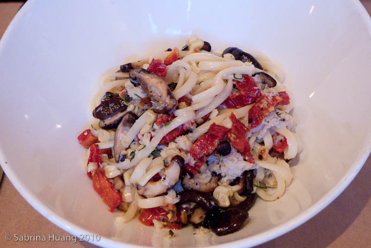 Linguine…Tossed w/ Canadian Crabmeat, Shiitakes, Sun-Dried Tomatoes & Corn
