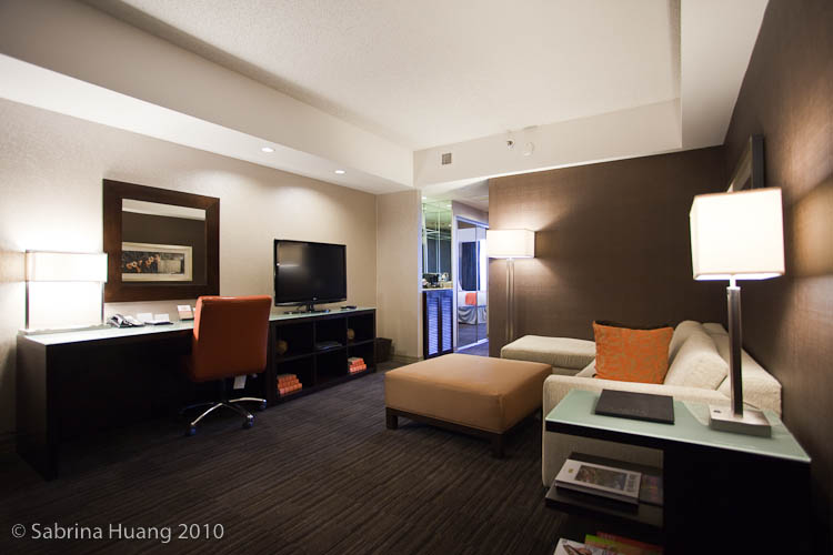 Hyatt是贊助廠商之一, 給參展者很好的房價優惠 ($109/night for Suite), 而且又是Headquarter, 當然就下住這啦. 去年底才整修完畢, 重新開幕的凱悅, 一走進房間讓人眼睛為之一亮 (官網上的照片更讚), 搞得老公馬上問我這一晚是多少錢啊?! 可惜我的行程排得太滿, 連飯店的游泳池都沒機會碰咧.