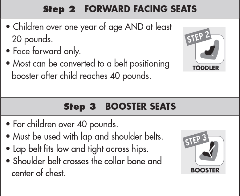 Children *MUST* be secured in an appropriate child passenger restraint (safety seat or booster seat) IN THE BACK SEAT OF A VEHICLE until they are at least 8 YEARS OLD or 4′ 9″ in height.