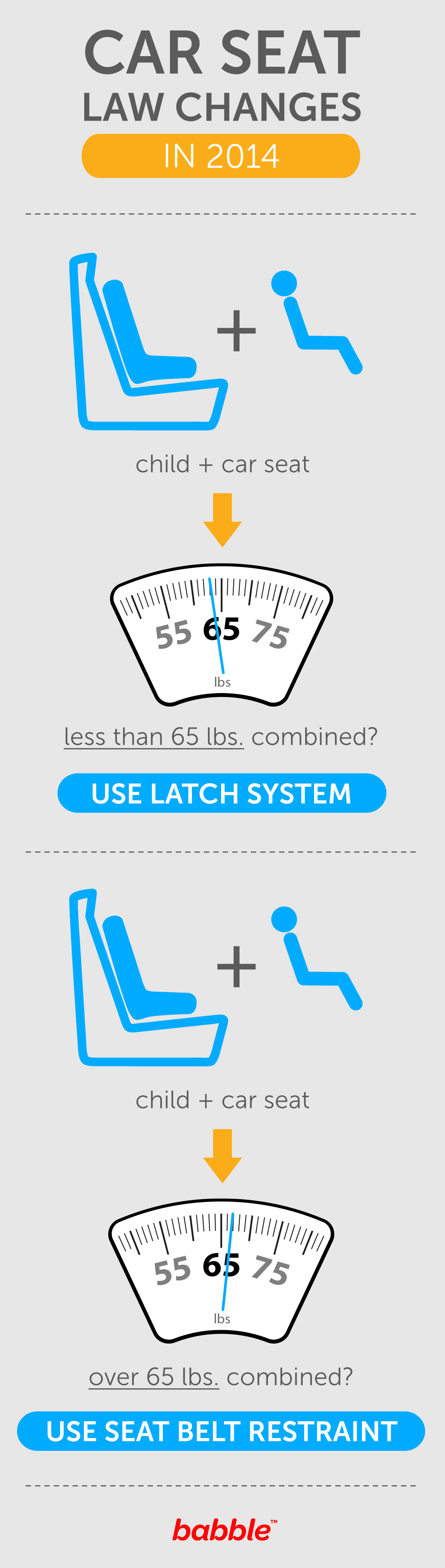 New law for 2014: Weigh your child, then weight the seat, then add them together. If they’re over 65lbs combined, start using the seat belt restraint versus the LATCH system.