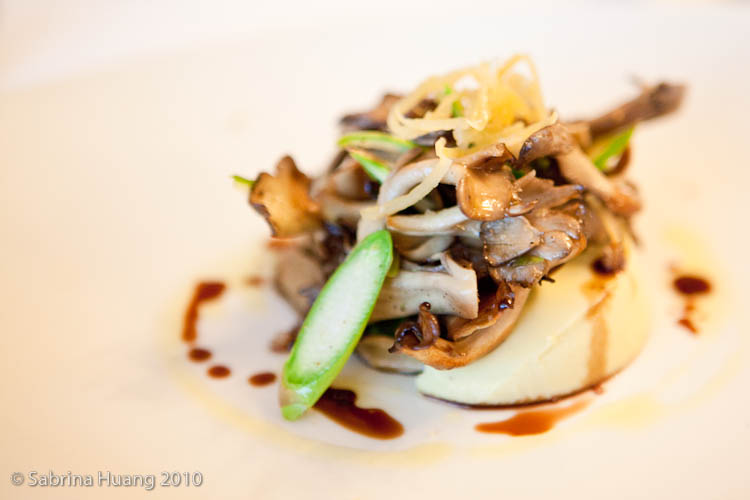 First Course – Roasted Maitake Mushroom and Shaved Asparagus Salad with Smoked Salt. 這份沙拉我和老公共享, 餐廳很貼心的將原本一盤的份量, 作成二小份獨立的方式上菜. 最底端好像是蘆筍布丁還是慕斯, 吃香菇的時候有吃到小顆粒狀的鹽, 最上端好像是糖醃漬的檸檬皮絲, 整體味道很不錯, 不會太鹹, 我也喜歡它的醬汁份量不多.