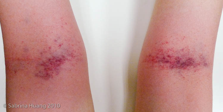這個拍打法 (又稱吊傷法, 古法一種), 是用手掌貼著肉, 以規律的節奏拍打 (醫生說塗點水拍比較不痛, 我覺得一樣痛), 藉此促進血液循環. 健康的人頂多拍紅, 不健康的人, 就會出痧 (毒血), 顏色越深, 表示體內累積的毒素越多. 這個需要別人代勞打, 因為太痛, 自己下不了手.