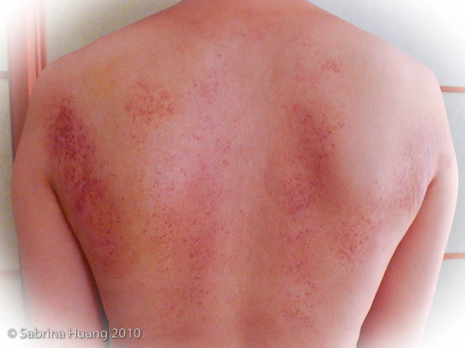 我說: 怎麼不痛? . . . 這下我才知道, 原來前二次那麼痛是不正常, 或者說, 因為我身體有問題, 才會那麼痛. 而且這次後背比起之前二次實在不算什麼, 只有大片分散的紅點狀, 實在太奇妙了.