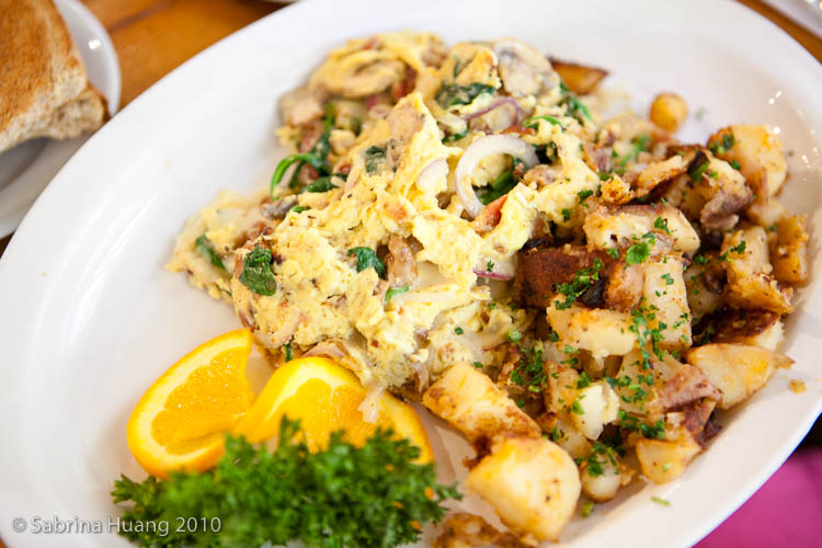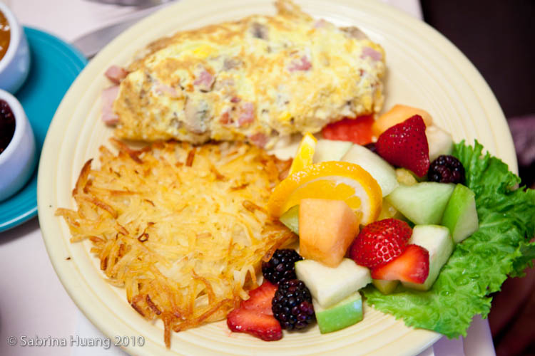 Omelettes Three large eggs, fresh fruit, hash browns or cottage potatoes and choice of English muffin, walnut wheat, sourdough, rye, whole wheat, or cinnamon raisin toast.