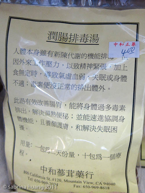 這家中和蔘茸藥行位在800 California St, Mountain View (就在那家西班牙餐廳的右後方), 老闆Willie Tam (譚力迅) 是香港人, 為人親切, 而且很能聊, 我去抓藥的時候剛好他很忙, 我就趁著等候的這段時間和他聊起有關香港回歸大陸後的生活, 有關藥材的來源和選擇, 如何煲湯養身, 才知道原來他們家到他爸爸那一輩是連續五代都是做中醫開中藥店的, 他們當初在香港的歷史悠久, 後來是因為陣亂, 為了避險而改店名.