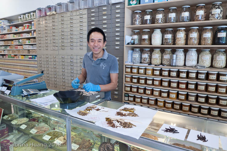 而他從小就在家裡的中藥店幫忙, 邊做邊學, 但是因為老挨師傅的罵, 而不願意走上中醫一途, 等他年紀漸長, 想學中醫時, 被老爸建議半桶水又有年紀了, 還是不要害人, 乖乖做只抓藥不看病的中藥店. 跟他聊到現今很多老美也學中醫, 他說因為有越來越多的老美認為中醫的療法是比較天然, 講究預防, 養身, 而不像西醫講求藥到病除的快速. 我說中醫那麼多, 應該也有分等級/水準/功力的吧. 他說當然有分, 有的中醫把脈功力不夠, 就得引導病人說出不舒服的地方, 然後配上它把脈得來的訊息, 拼湊出可能的問題和解決方式.