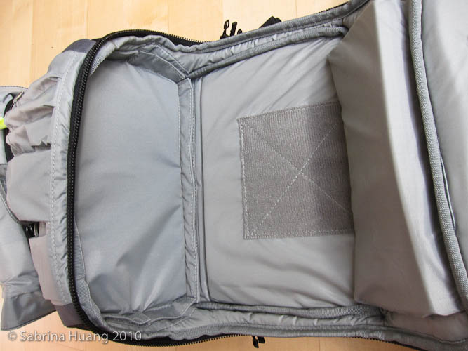 想要真的可以側邊快取相機, 必須將活動式格層做些變動. 我先把所有的隔層都拿掉, 把中間(左手邊那一層)的隔層反過來黏 (記憶卡袋到另外一邊), 這樣可以增加約2.5cm的空間出來.