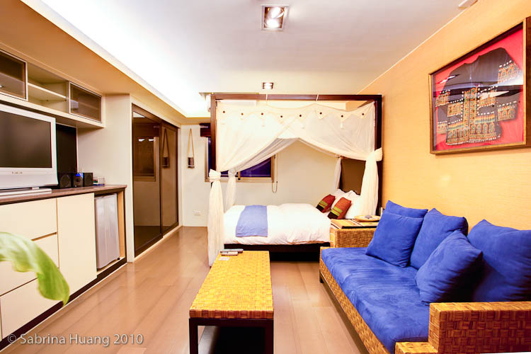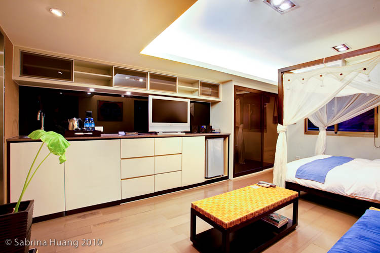 我這次入住的是一館, 約八坪左右, 整體室內設計走現代簡單風格, 一張Queen Size床, 衣櫥(七個衣架, 三個吊區, 二個大抽屜), 沙發, 電視, CD Player, 有無線網路, 洗脫乾衣機, 冰箱, 電磁爐, 電熱水爐, 茶包咖啡包, 瓶裝水, 茶杯, 洗衣精, 洗手乳, 沐浴乳, 洗髮潤絲精, 衛生紙, 吹風機, 毛巾, 雨傘等等.