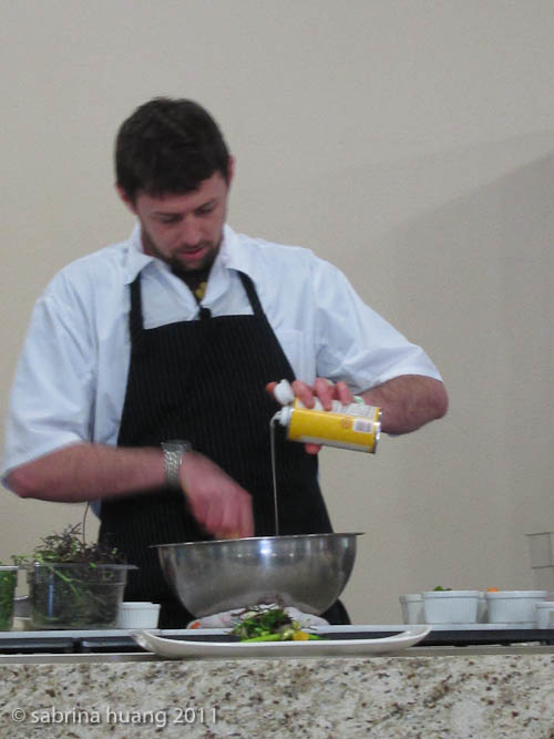 每天都有一場Chef's Cooking Demo, 我們參加的是Sean Baker (Gather Restaurant, Berkeley), 他當天做了二道沙拉 – (上圖)第一道是蘆筍削片,香菇切碎, 加上Dressing, 基本上是生食Raw Food.