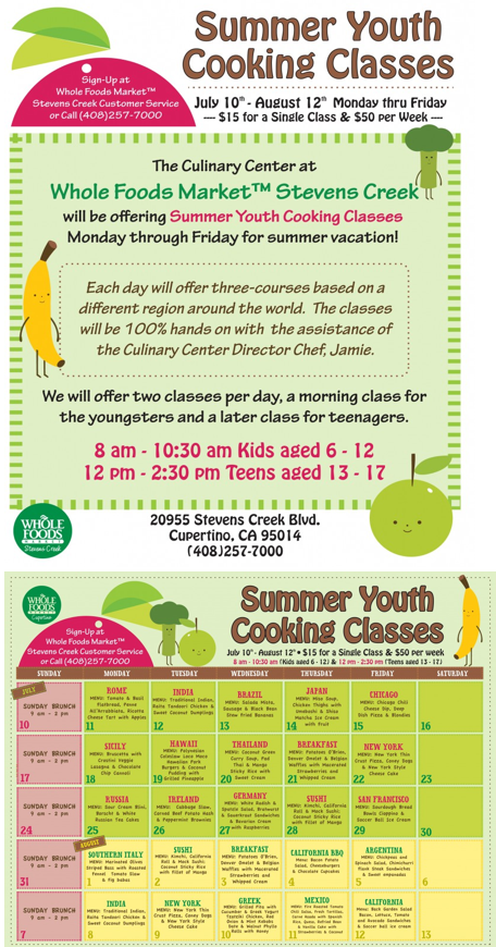 我和好友見面時聊到暑假課程, 她告訴我Cupertino的Whole Food今年從7/10-8/12的週一到週五有辦一個Summer Youth Cooking Classes, 按年紀分上午和下午梯次, 每天都有不同國家的烹飪Theme, 每次分組做二到三道菜(其中之一會是甜點類), 然後大家一起享用成果. 好友弟弟的二個十來歲的孩子暑假來找姑姑玩, 加上我的二個乾兒子, 四個大小朋友一起報名上了三堂烹飪課.