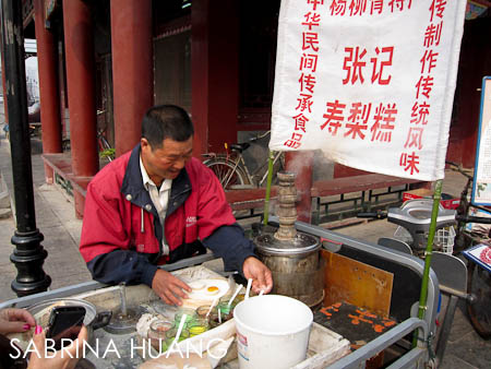 天津當地早餐 – 左邊是燒餅夾火腿茶葉蛋$1.50, 上面是煎餅果子$2.80, 右邊是大餅雞蛋$3.30