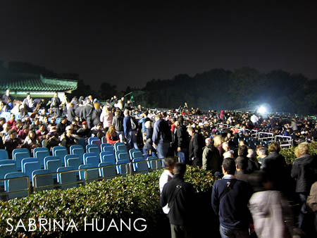 吃完晚飯後去看張藝謀的印象西湖 (7:45pm/十一月一日開始改為7:15pm), 表演場地在岳廟對面. 多數旅行團都在肯德基周邊等候, 建議事先上淘寶網買票($160左右)或是到了肯德基外面找仲介買($200左右), 旅店代買或售票口直售就是票面價$260. 晚上很涼, 建議帶保暖外套, 或者租件羽絨大衣.