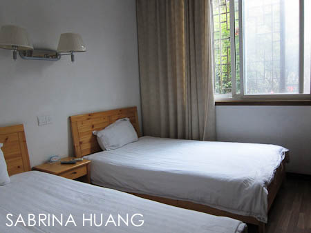 他們的二人房標間 (獨立衛浴/空調/有窗) 價錢比其他西湖附近的一般旅館要便宜很多 (雖然那個價錢還是不便宜), 實際入住後發現, 房間/浴室很小, 水槽周邊縫隙都發霉發黑, 毛巾又灰又舊 (我家拿來洗車用的毛巾都比這乾淨), 床很硬, 牆壁油漆一碰就掉, 房間內只有電熱水瓶, 電視, 空調, 毛巾 (必須自備洗髮/沐浴/香皂).